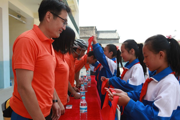 小學生們滿懷感恩地為凱發(fā)k8國際騎行隊的代表系紅領巾