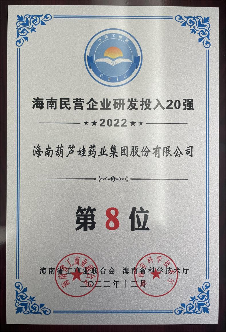 12月23日,2022海南民營企業50強和研發投入20強發布會在?誥儺。會上發布了“2022海南民營企業50強”“2022海南民營企業研發投入20強”榜單和分析報告。凱發k8國際藥業再次榮登兩榜,在海南民營企業50強榜單中位列第25位,較去年上升8位,這也是公司連續三年登榜;在海南民營企業研發投入20強中位列第8位,較去年上升7位。