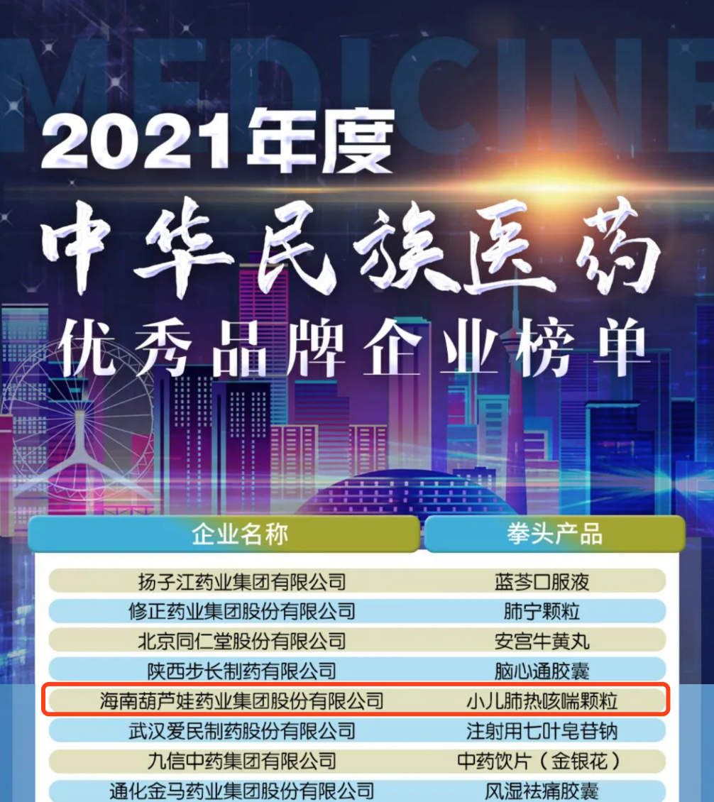 12月29日,全國工商聯(lián)醫(yī)藥業(yè)商會發(fā)布了“2021年度中華民族醫(yī)藥優(yōu)秀品牌企業(yè)榜單”,凱發(fā)k8國際藥業(yè)集團憑借黃金單品小兒肺熱咳喘顆粒(4克)實力登榜。