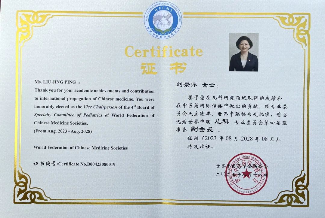 凱發(fā)k8國際藥業(yè)集團黨委書記、董事長劉景萍當選世界中醫(yī)藥學(xué)會聯(lián)合會兒科專業(yè)委員會第四屆理事會副會長