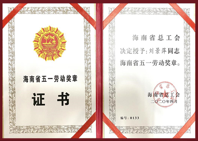 巾幗風范:劉景萍董事長被授予海南省五一勞動獎章
