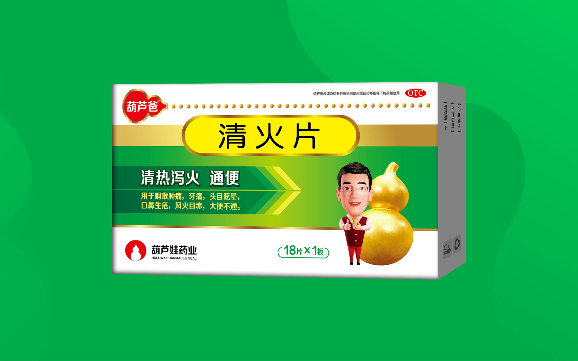 大青葉、大黃、石膏、薄荷腦。輔料為淀粉。